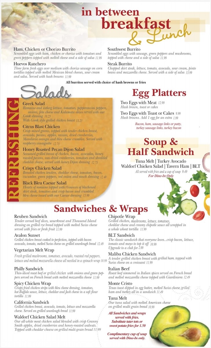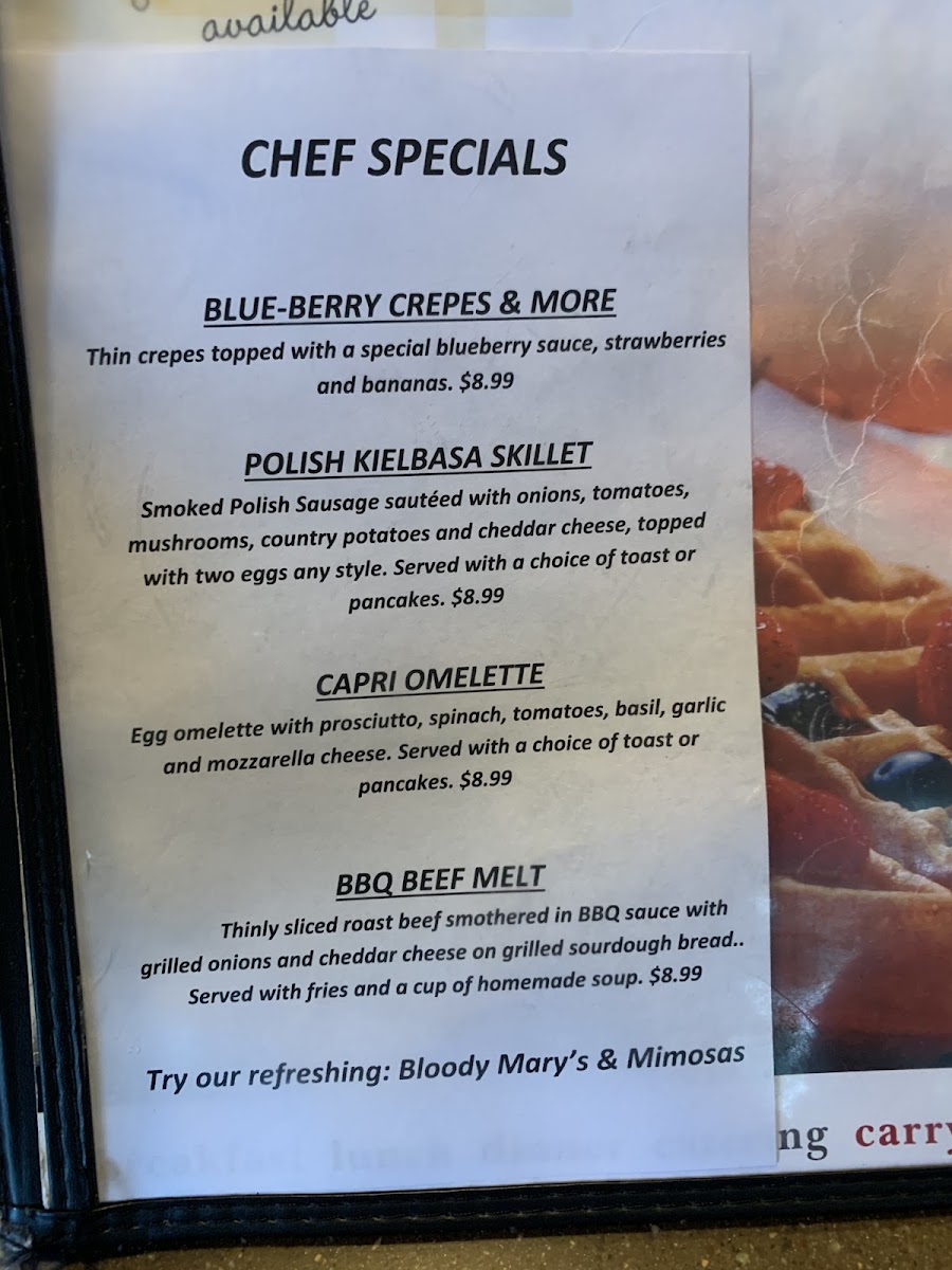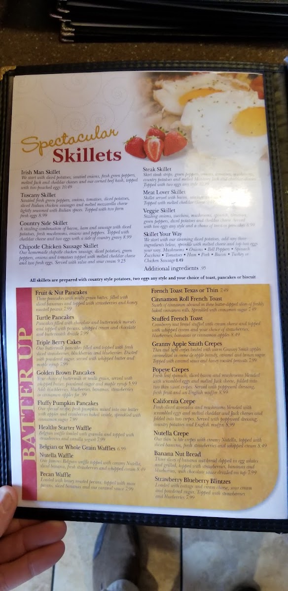 The menu highlights include thoughtfully prepared omelettes, like the Denver or Tuscany, as well as inventive takes on traditional staples such as French Toast Relleno and Meat Lover Skillets. Light options such as crepes—both plain and filled with Nutella—offer a gentler start, while savory lunch choices like the Monte Cristo Sandwich and Tuna Melt transition smoothly into the afternoon.