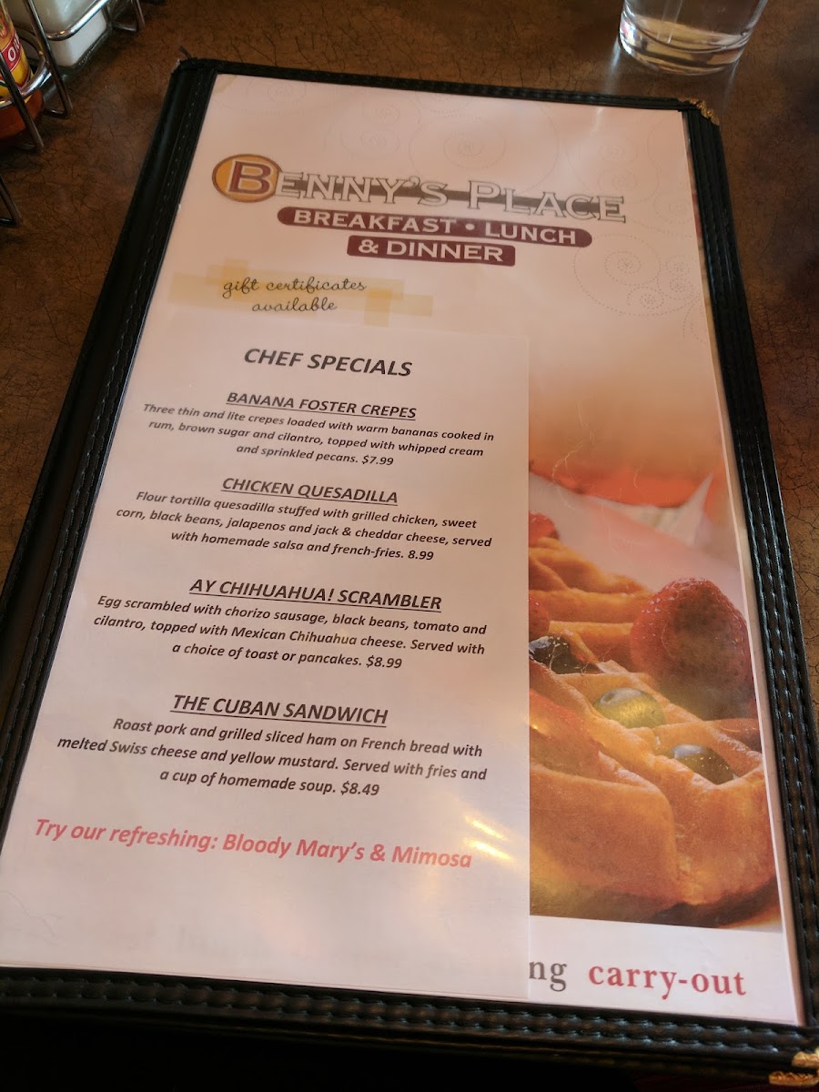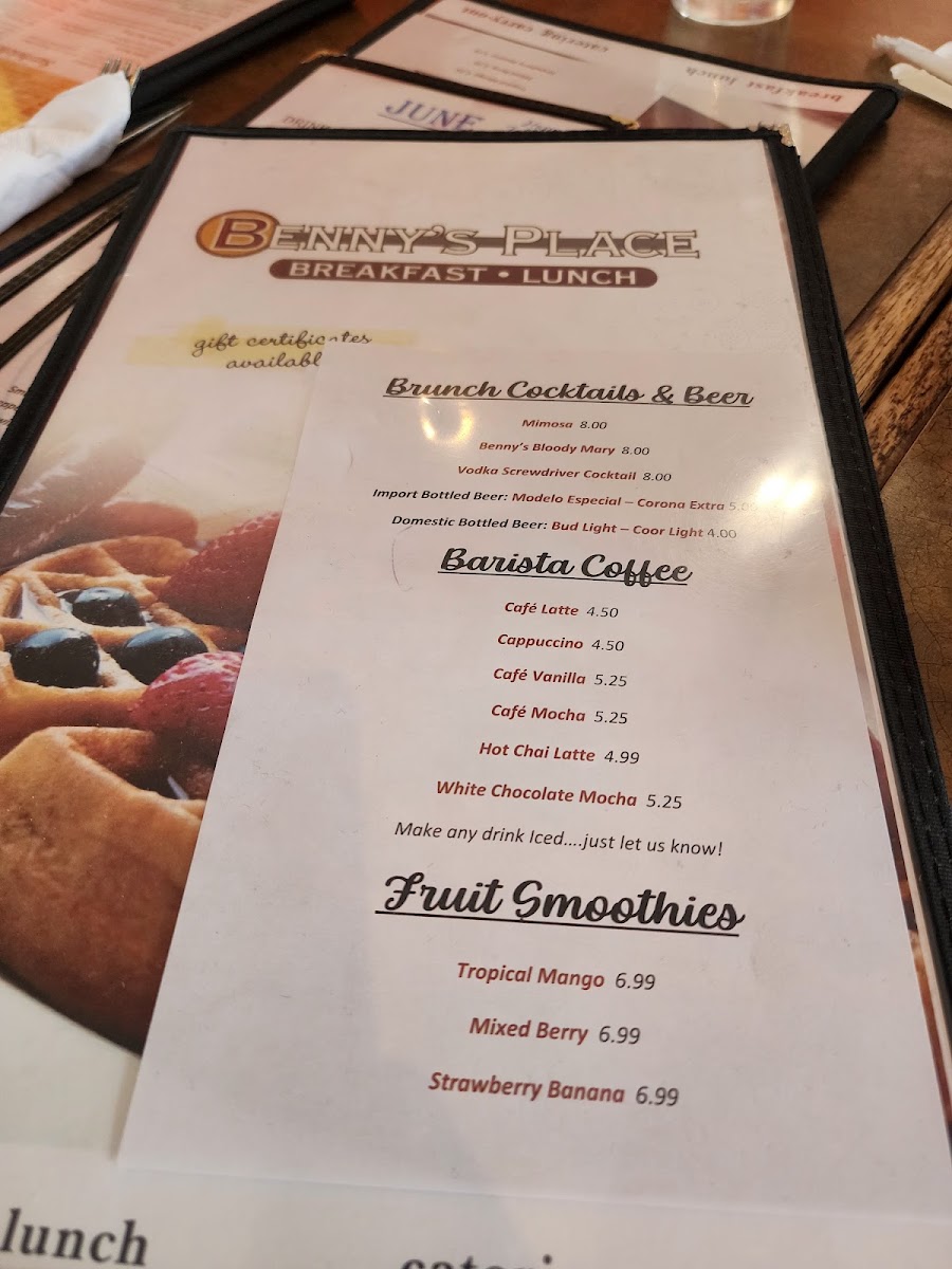 Benny’s Place offers a welcoming menu that blends traditional American breakfast and lunch favorites with simple café comforts. The selection invites guests to enjoy hearty morning meals or casual midday plates in a relaxed, family-friendly setting. Whether you're stopping in for pancakes that carry a hint of seasonal flavor or a classic breakfast platter, the dishes are designed to provide satisfying, comforting flavors without fuss.